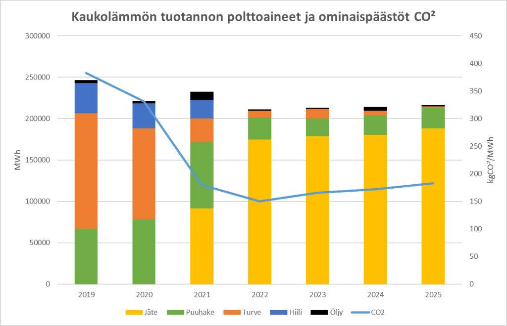 Eri polttoaineiden osuudet vuonna 2025 olivat noin: jätepolttoaine 87 %, puuhake 11,6 %, turve 0,6 % ja öljy 0,8 %. Käytetystä öljystä 63 % oli uusiuvaa HVO-öljyä. Tuotetun kaukolämmön hiilidioksidin ominaispäästö vuonna 2025 oli 182,8 kg CO2/MWh.